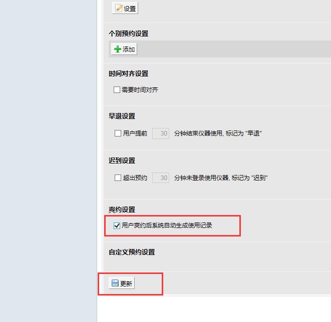 3、勾选需要预约,并勾选爽约设置后点击更新完成。其它选项可根据实际情况进行选择。