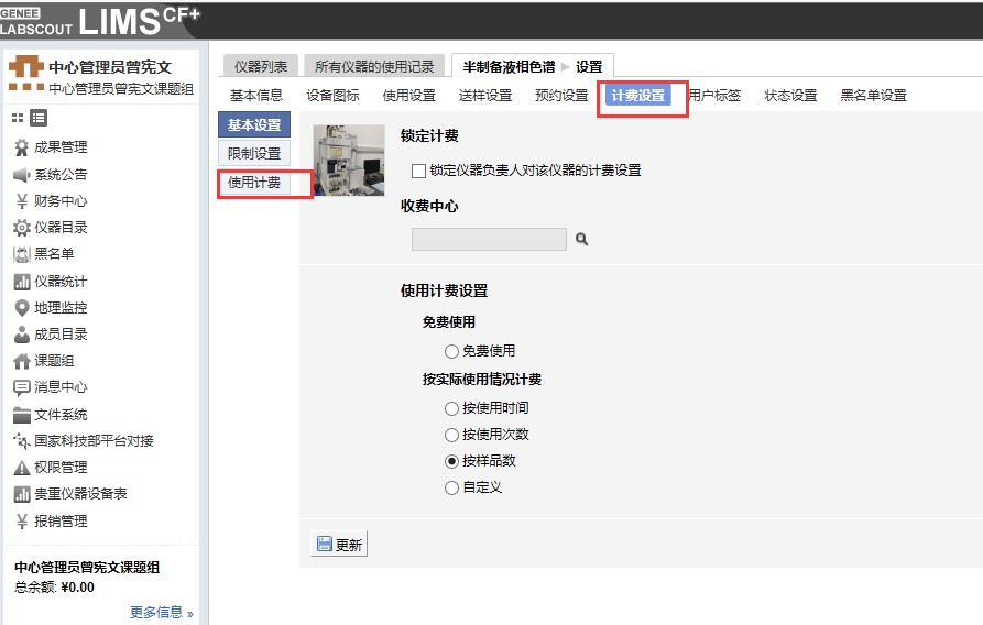 4、找到计费设置,在使用计费或送样计费中添加个别收费标准,用户标签中选择前面设置的标签名称,收费标准中输入单价后点更新完成。