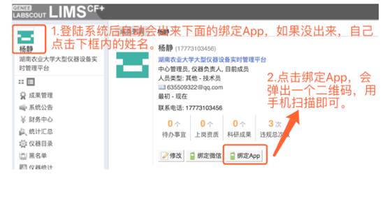 4、登陆学校大型仪器共享管理平台的网站,点开绑定 APP,展示出二维码,手机扫码绑定。