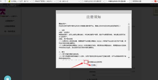4、进入贵重仪器共享管理平台注册界面,勾选注册须知,再点击同意。