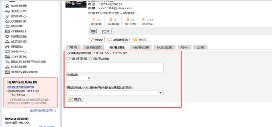 2、登录后在系统左侧会出现红色提醒,有未反馈信息。此时点击仪器名称会弹出提交反馈的相关内容,按要求填写后提交就可以,如有多个未提交反馈情况,请将所有的提交反馈信息后才能使用设备。