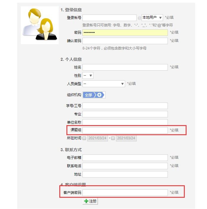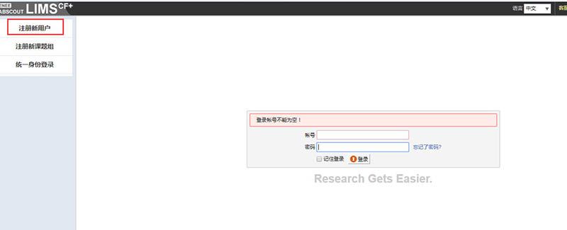3、加入系统已有课题组的用户请选择注册新用户,注册完成后请联系课题组负责人激活账号。课题组负责人也可自行添加账户。